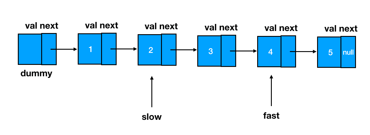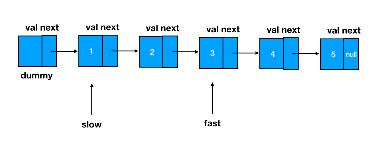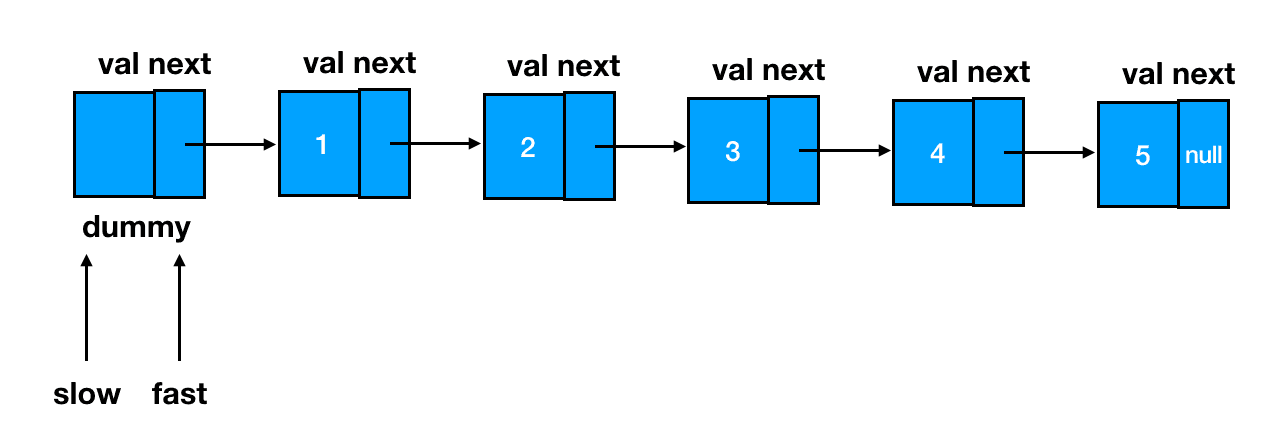 按照我们已经预告过的思路,首先两个指针 slow 和 fast,全部指向链表的起始位——dummy 结点: