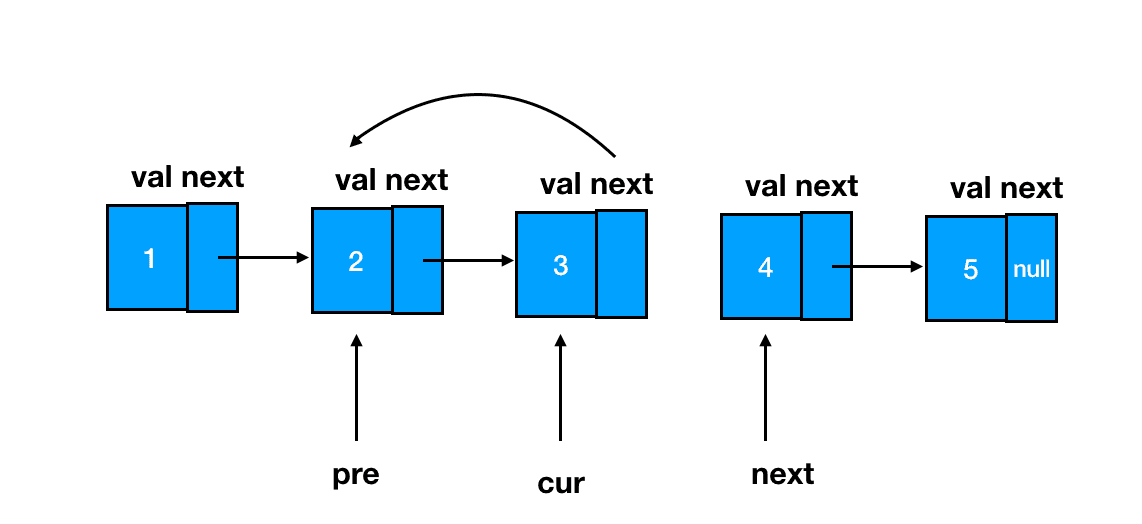 此时我们直接将结点2的 next 指针指向 cur、将结点1的 next 指针指向 pre 即可。