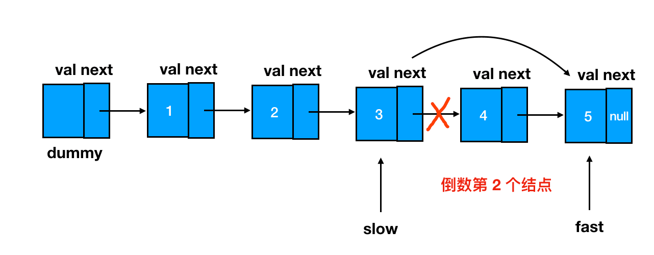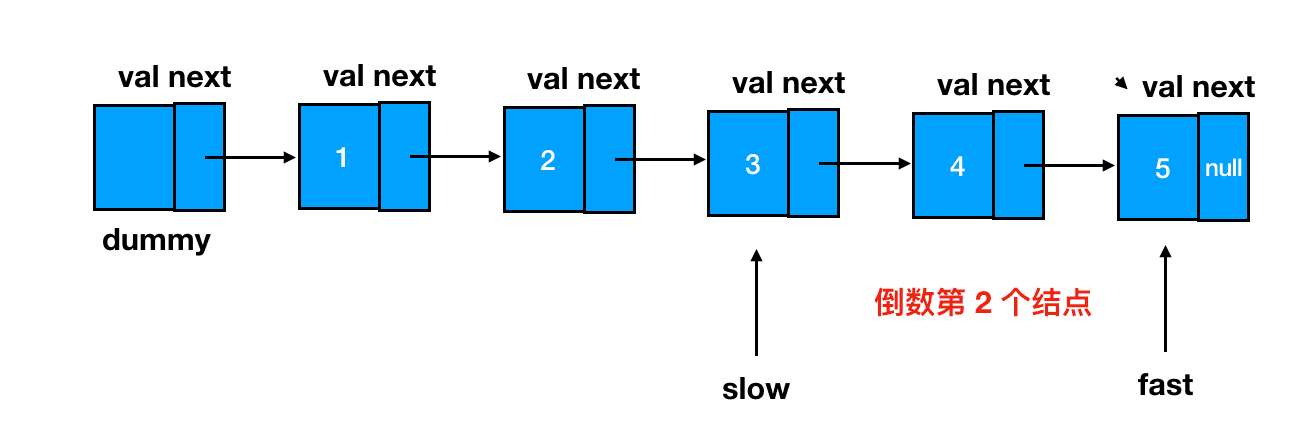 快指针先出发!闷头走上 n 步,在第 n 个结点处打住,这里 n=2:
