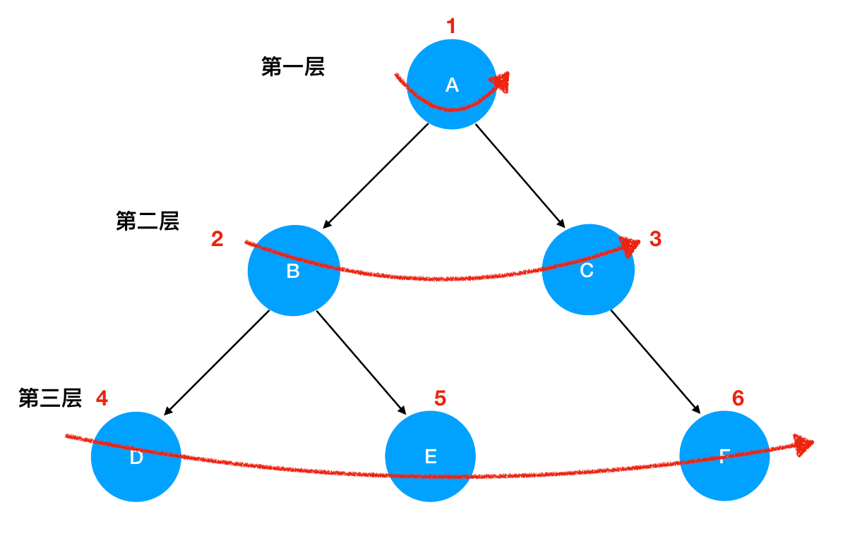 现在我们要做的是对这个二叉树进行层序遍历。层序遍历的概念很好理解:按照层次的顺序,从上到下,从左到右地遍历一个二叉树,如图所示(红色数字即为遍历的序号):