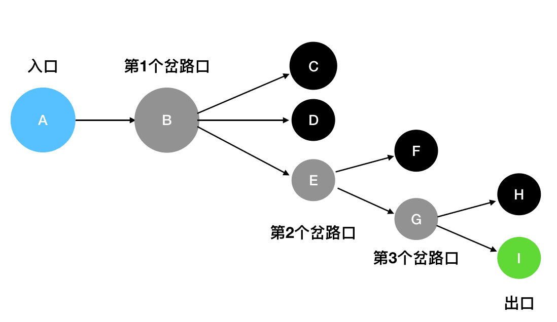 • 你选择的这条路未必是一条通路。如果你走到最后发现此路不通,那么你就要退回到离你最近的那个分叉路口,然后尝试看其它的岔路能不能走通。如果当前的岔路口分叉出去的所有道路都走不通,那么就需要退回到当前岔路口的上一个岔路口,进一步去寻找新的路径。