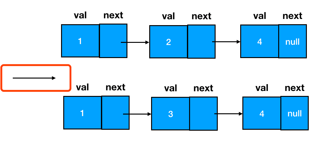 两个链表如果想要合并为一个链表,我们恰当地补齐双方之间结点 next 指针的指向关系,就能达到目的。