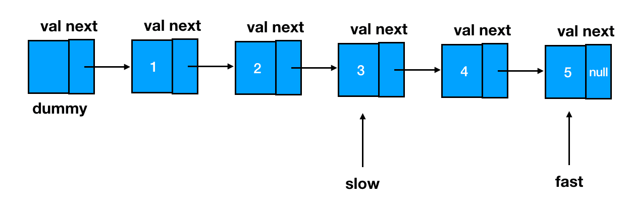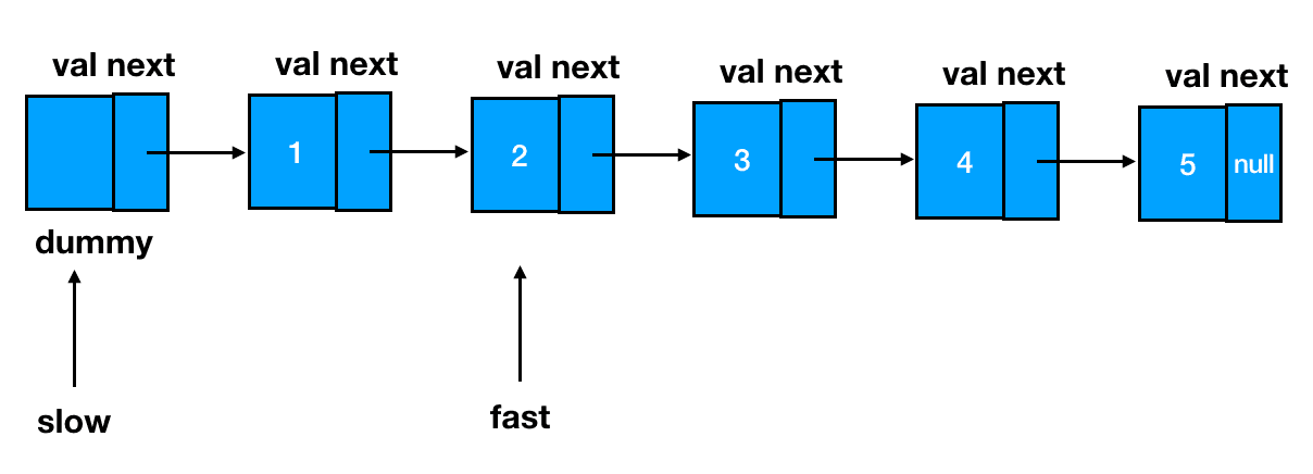 按照我们已经预告过的思路,首先两个指针 slow 和 fast,全部指向链表的起始位——dummy 结点: