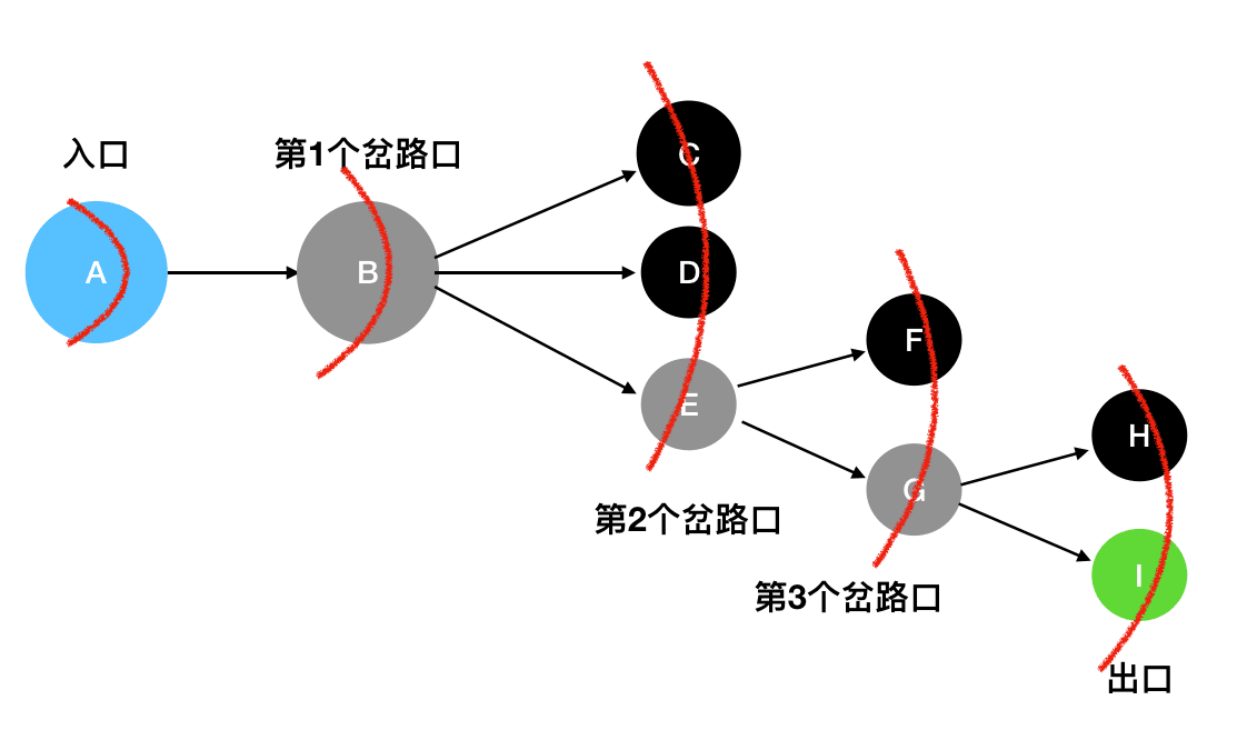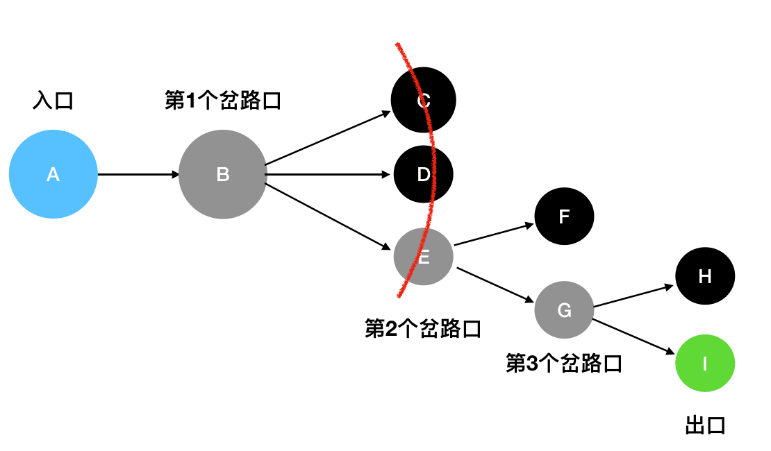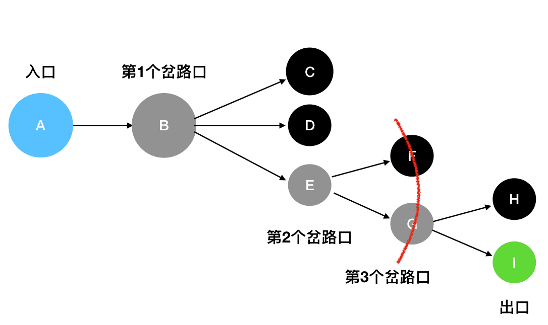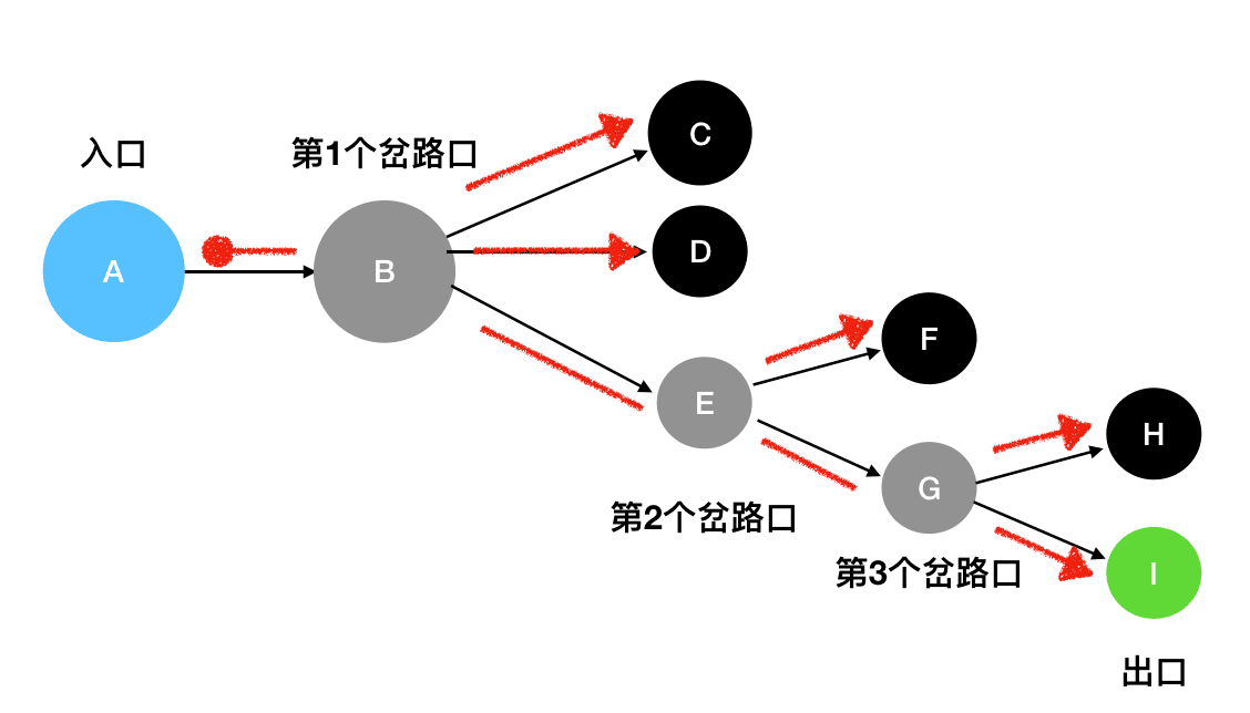 • 你选择的这条路未必是一条通路。如果你走到最后发现此路不通,那么你就要退回到离你最近的那个分叉路口,然后尝试看其它的岔路能不能走通。如果当前的岔路口分叉出去的所有道路都走不通,那么就需要退回到当前岔路口的上一个岔路口,进一步去寻找新的路径。