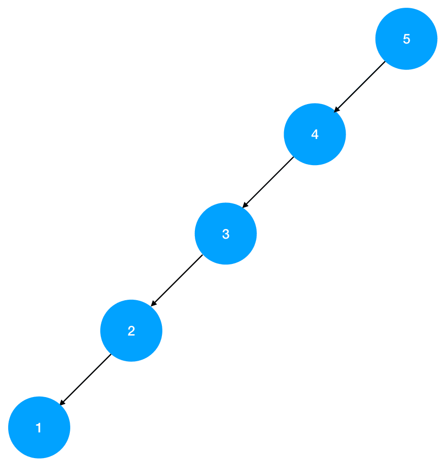 大家可以仔细想想,为什么科学家们会无中生有,给二叉树的左右子树和根结点之间强加上排序关系作为约束,进而创造出二叉搜索树这种东西呢?难道只是为了装x吗?当然不是啦。 二叉搜索树的妙处就在于它把“二分”这种思想以数据结构的形式表达了出来 。在一个构造合理的二叉搜索树里,我们可以通过对比当前结点和目标值之间的大小关系,缩小下一步的搜索范围(比如只搜索左子树或者只搜索右子树),进而规避掉不必要的查找步骤,降低搜索过程的时间复杂度。但是如果一个二叉搜索树严重不平衡,比如说上面这棵链式搜索树: