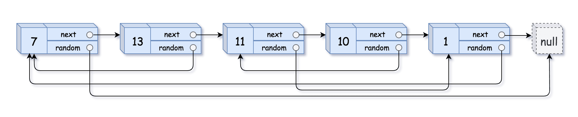 输入:head = [[7,null],[13,0],[11,4],[10,2],[1,0]] 输出:[[7,null],[13,0],[11,4],[10,2],[1,0]]
