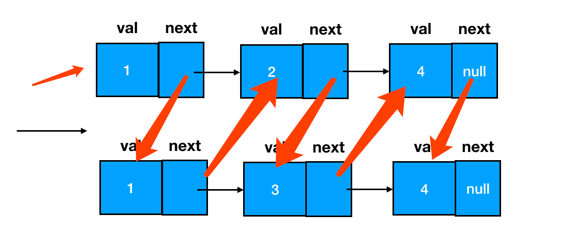 两个链表如果想要合并为一个链表,我们恰当地补齐双方之间结点 next 指针的指向关系,就能达到目的。